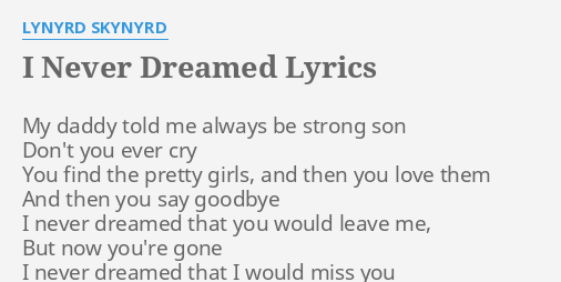 LYNYRD SKYNYRD : I Never Dreamed lyrics Lyrics to 'I Never Dreamed' by LYNYRD SKYNYRD : My daddy told me always be strong son / Don't you ever cry / You find the pretty girls and then you love them / Then you say goodbye / I never dreamed that you would leave me / But now you're gone / I never dreamed that I would miss you /