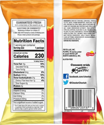 Hot Cheetos Nutritional Facts | livestrong Although Hot Cheetos contain a significant number of calories, fat and sodium, the snack does provide some essential vitamins and minerals. Each serving offers 2 percent the recommended daily value for iron and riboflavin, as well as 4 percent of the recommended daily value for vitamin E, thiamin and niacin. Cheetos Crunchy Flamin' Hot Cheese Flavored Snacks, 8.5 oz Bag ... Calories per gram: Fat 9 • Carbohydrate 4 • Protein 4 . Product details. Hot, spicy flavor packed into crunchy, cheesy snacks. ... I bought a bag of hot cheetos and the expiration date is Nov 15, 2022 and the chips are STALE. Highly disappointed' Renee. ... But now I can eat the big bag in one day. As of 09/12/22 I can't find these in any ...