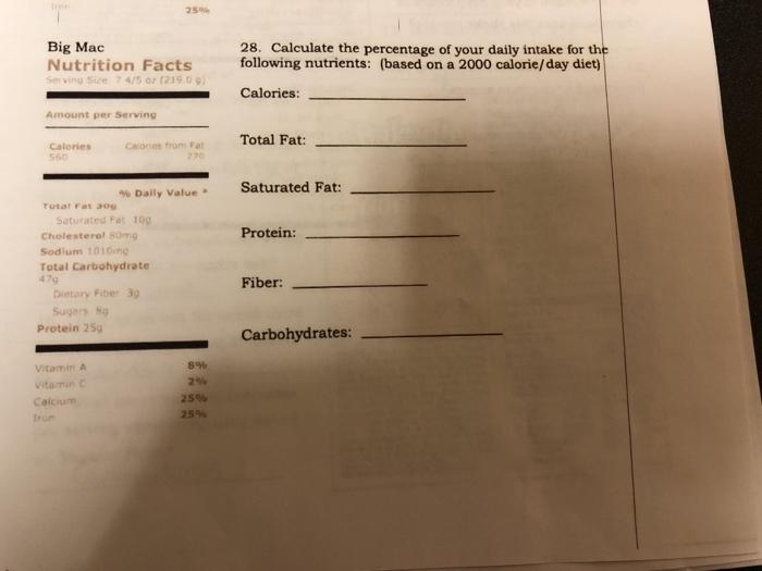 Nutrition Facts for McDonalds Big Mac - myfooddata McDonalds Big Mac · Calories 563 28% DV · Protein 26g 52% DV · Carbs 44g 15% DV · Fat 33g 42% DV · Fiber 3.5g 13% DV · Sugar 8.7g 17% DV.