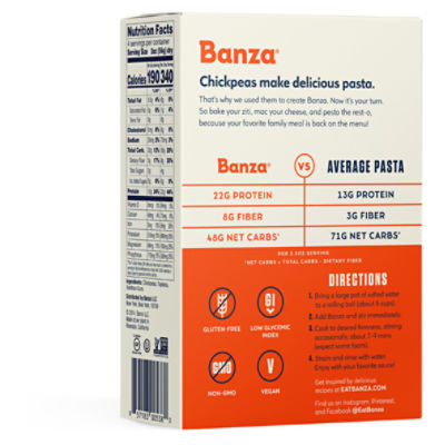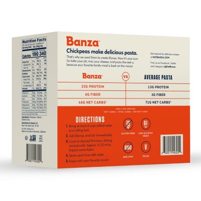 Banza Chickpea Pasta Shop our delicious pasta made from chickpeas. Naturally gluten free, Banza has 25G of protein and 40% fewer net carbs in every serving. Finally, a pasta that loves you back!