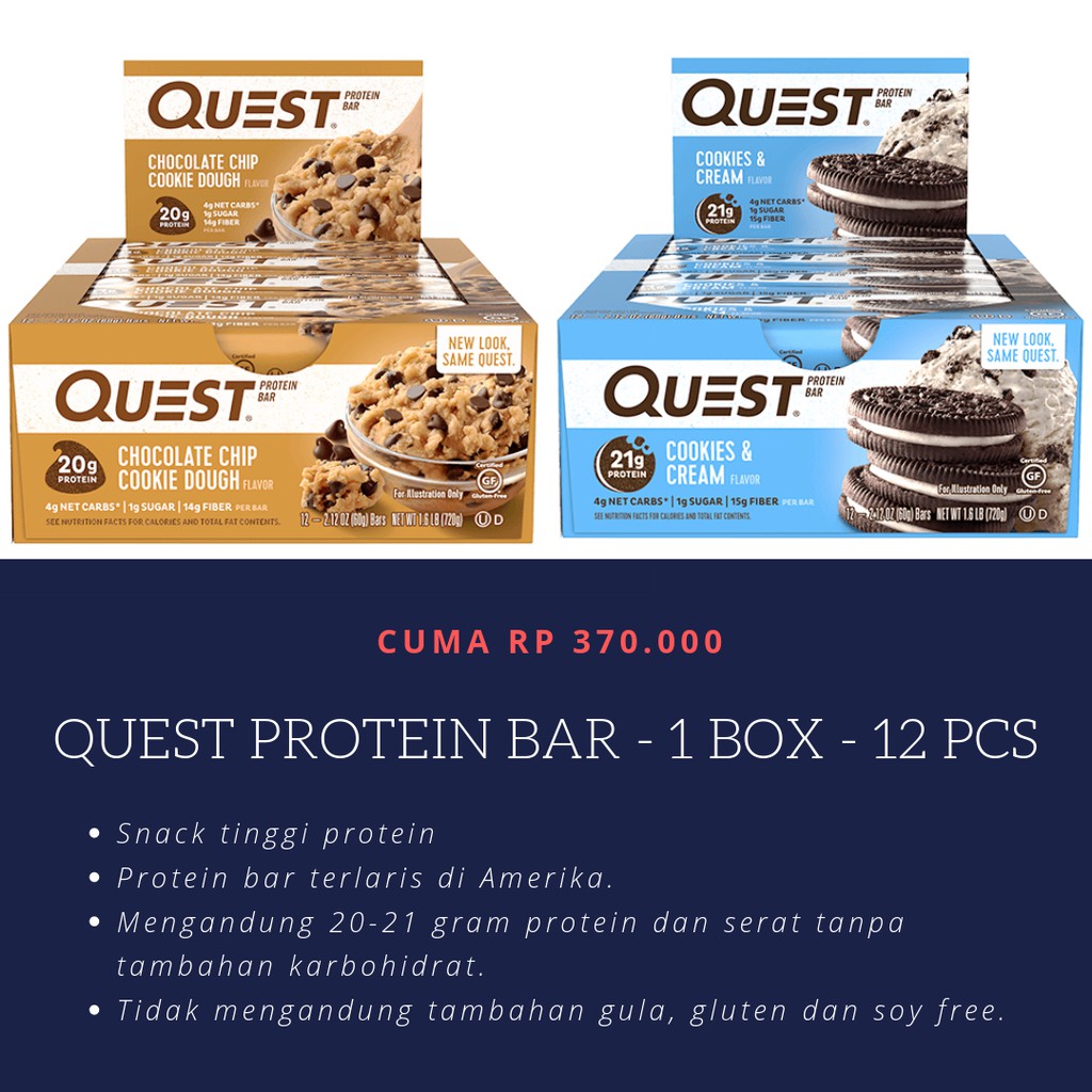 Quest Protein Bars by Quest Nutrition - Supplement Mart Every bite of this delicious snack is packed with Milk Protein Isolate, Whey Protein Isolate, Prebiotic Fibre and many other amazing ingredients. With roughly ... Protein bar by QUEST BAR - Nutritional Value Protein bar by QUEST BAR contains 190 calories per 60 g serving. This serving contains 9 g of fat, 20 g of protein and 21 g of carbohydrate. The latter is 2 g ...