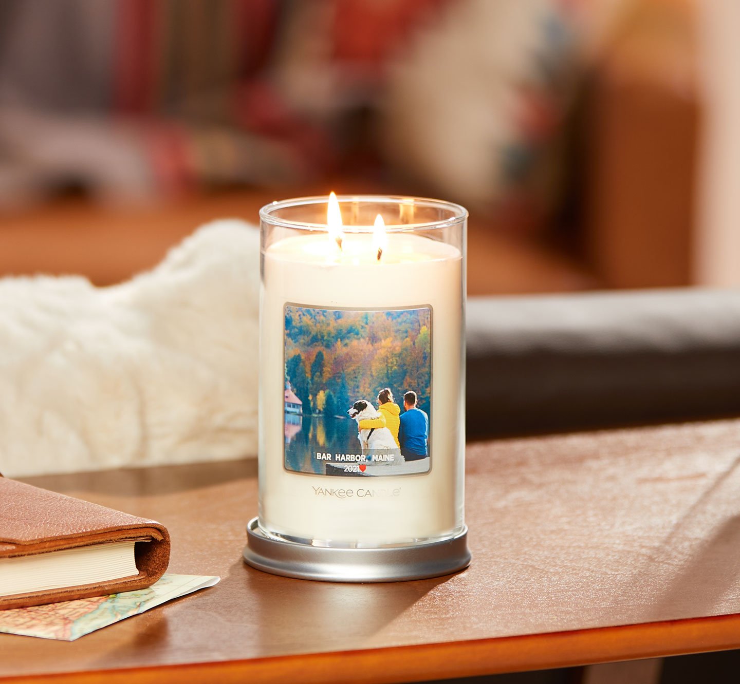 Custom & Personalized Candles | Yankee Candle | WoodWick Candle 1. Select a Style Choose from a popular collection of candle shapes & sizes. 2. Pick a Fragrance Find their favorite scent, or pick out the perfect match. 3. Add a Photo Upload one they'll love to feature on the candle's label. 4. Create a Message Write a from-the-heart message to make your photo shine.