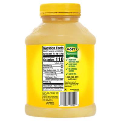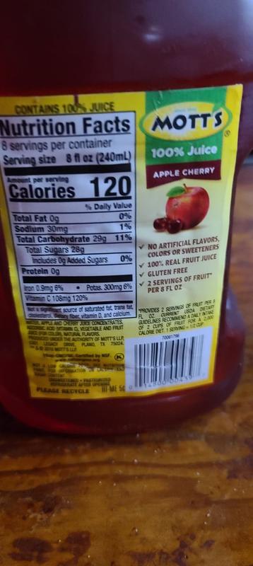 Mott's 100% Original Apple Juice, 64 fl oz bottle - Walmart.com Packed with ripe apple flavor, Mott's Original Apple Juice is 100% fruit juice and delivers 2 servings of fruit in each 8 fl. oz cup, per current USDA Dietary Guidelines. It's also an excellent source of Vitamin C, contains no added sugar and has a delicious taste the whole family will love. Mott's® 100% Original Apple Juice Mott's juices taste good and are good for you. Each 8 oz. glass provides your family with two servings of fruit*. Enjoy Mott's in a variety of sizes. Available in family size, 6.75 oz. boxes, and 8 oz. bottles for families on the go. Calories 120 Serving Size 8 fl. oz. Ingredients WATER, APPLE JUICE CONCENTRATE, ASCORBIC ACID (VITAMIN C) Mott's® Apple Light Each bottle of Mott's Apple Light provides 1½ servings of fruit. Available in family size. Calories 50 Serving Size 8 fl. oz. Ingredients WATER, APPLE JUICE CONCENTRATE, MALIC ACID, ASCORBIC ACID (VITAMIN C), SUCRALOSE, NATURAL FLAVORS Available Sizes 64 oz. 1-8 of 56 Reviews Sort by: Most Recent ♀ ★★★★★ ★★★★★ penelope · a month ago