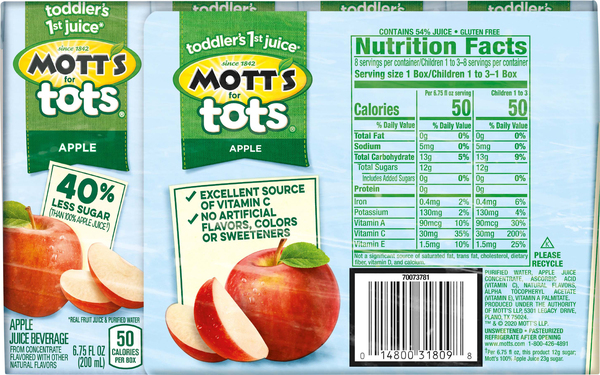 Mott's For Tots Apple Juice - 64 Fl Oz Bottle : Target Mott's for Tots Apple Juice - 64 fl oz Bottle $3.69When purchased online In Stock Add to cart About this item At a glance Gluten Free Highlights 40% less sugar than 100% apple juice Pediatrician preferred over regular juice 100% daily value of vitamin C Juice drink One 64 fluid ounce bottle Specifications Juices, Applesauces, Snacks, Recipes, and More | Mott's® Juices, Applesauces, Snacks, Recipes, and More | Mott's® Start Strong Healthy decisions today lead to a healthy future tomorrow. Enter Now NO PURCHASE NECESSARY. Enter Promotion by: 9/30/22. To enter and for Official Rules, visit Your mighty sidekick is here! Learn More About the Added Benefits & Kid-Approved Taste