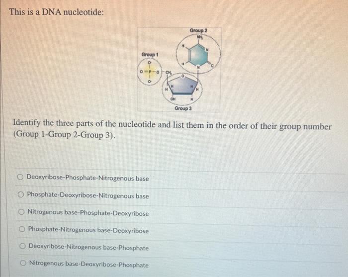 Nucleotide - Wikipedia A nucleotide is composed of three distinctive chemical sub-units: a five-carbon sugar molecule, a nucleobase (the two of which together are called a nucleoside), and one phosphate group.With all three joined, a nucleotide is also termed a "nucleoside monophosphate", "nucleoside diphosphate" or "nucleoside triphosphate", depending on how many phosphates make up the phosphate group. What Are The Three Parts Of A Nucleotide | Jacks Of Science Each nucleotide is composed of three parts: a sugar, a phosphate, and a nitrogen-containing base. The sugar molecule can be either ribose or deoxyribose, and the phosphate group is bonded to the sugar via a phosphodiester bond. The nitrogen-containing base is attached to the sugar via a nitrogenous base pair. What is a phosphate group? 9.1 The Structure of DNA - Concepts of Biology | OpenStax Now let's consider the structure of the two types of nucleic acids, deoxyribonucleic acid (DNA) and ribonucleic acid (RNA). The building blocks of DNA are nucleotides, which are made up of three parts: a deoxyribose (5-carbon sugar), a phosphate group, and a nitrogenous base ( Figure 9.3 ). There are four types of nitrogenous bases in DNA. What are the three parts of a nucleotide? | Socratic THREE parts include nitrogen containing base, sugar backbone and phosphate group figure shows adenine structure. nucleotide shown in the figure is divided into nitrogen containing base, sugar backbone and phosphate group