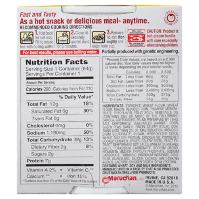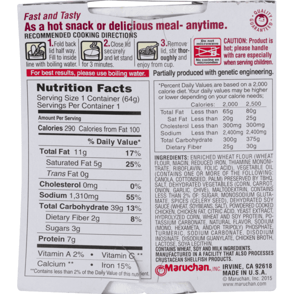 Maruchan Chicken Ramen Noodle Soup Cup - 2.25oz : Target Amount Per Serving: Calories: 290 % Daily Value* Calories From Fat 110Cal Total Fat 12g 18% Saturated Fat 6g 30% Trans Fat 0g Cholesterol 0mg 0% Sodium 1190mg 50% Total Carbohydrate 39g 13% Dietary Fiber 2g 8% Sugars 2g Protein 7g Vitamin A 2% Iron 15% * Percentage of Daily Values are based on a 2,000 calorie diet. Ingredients: