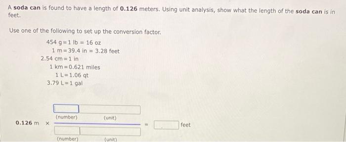 A soda can is found to have a length of 0.128 meters. Using unit ... A soda can is found to have a length of 0.128 meters. Using unit analysis, show what the length of the soda can is in centimeters. Unit Conversion: The object in the problem is a soda...
