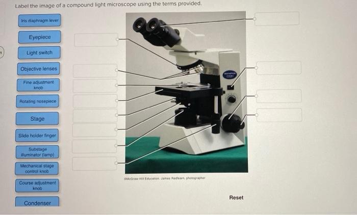 Solved Microscope parts/labeling 9 Label the image of a - Chegg Microscope parts/labeling 9 Label the image of a compound light microscope using the terms provided. 1 points eyepiece eyepiece light source References References base arm slide holder arm stage mechanical stage fine adjustment knob power switch objectives Mindeneer Microscopy Lab Homework Saved Help Save & Exit Submit eyepiece light source 9 …